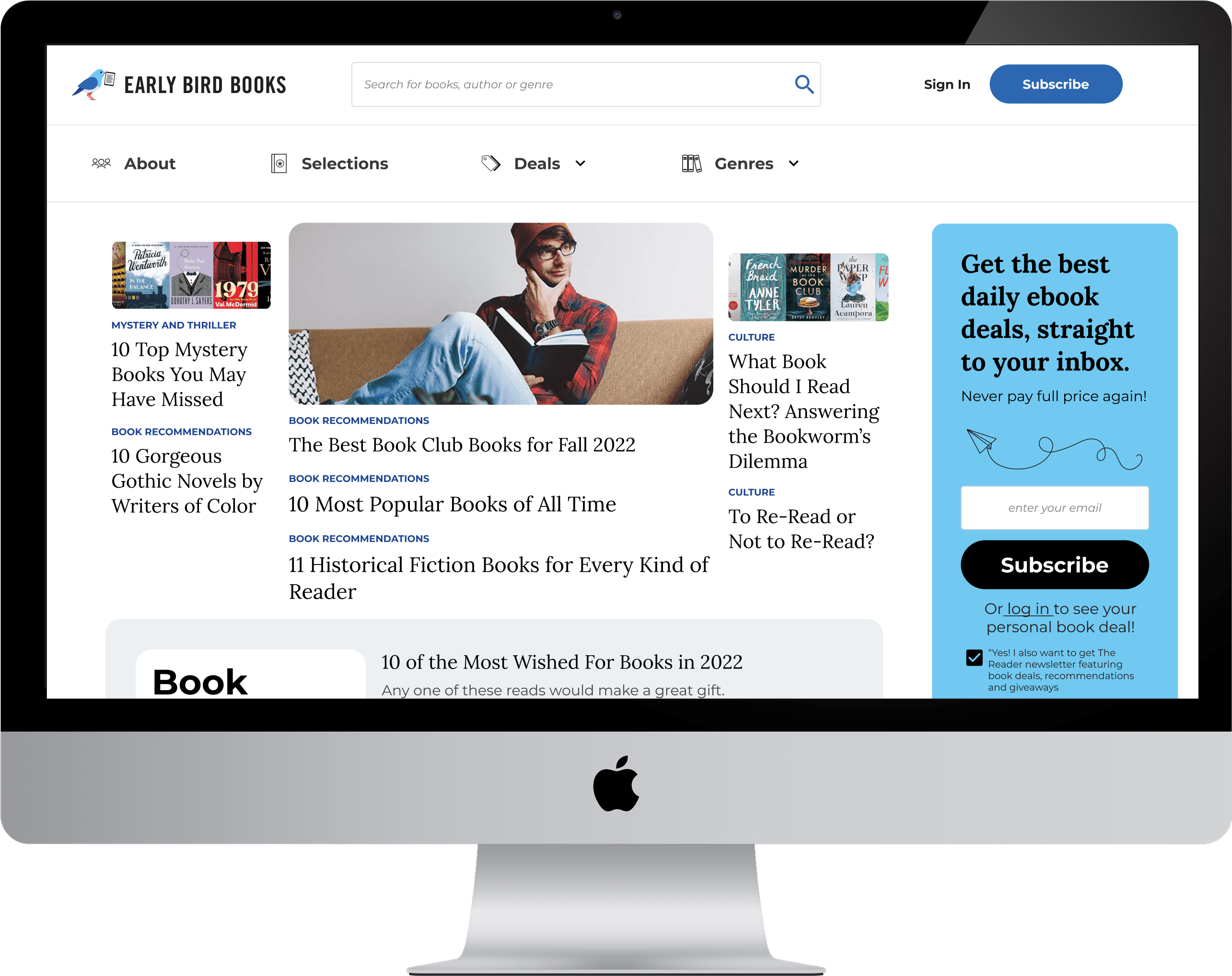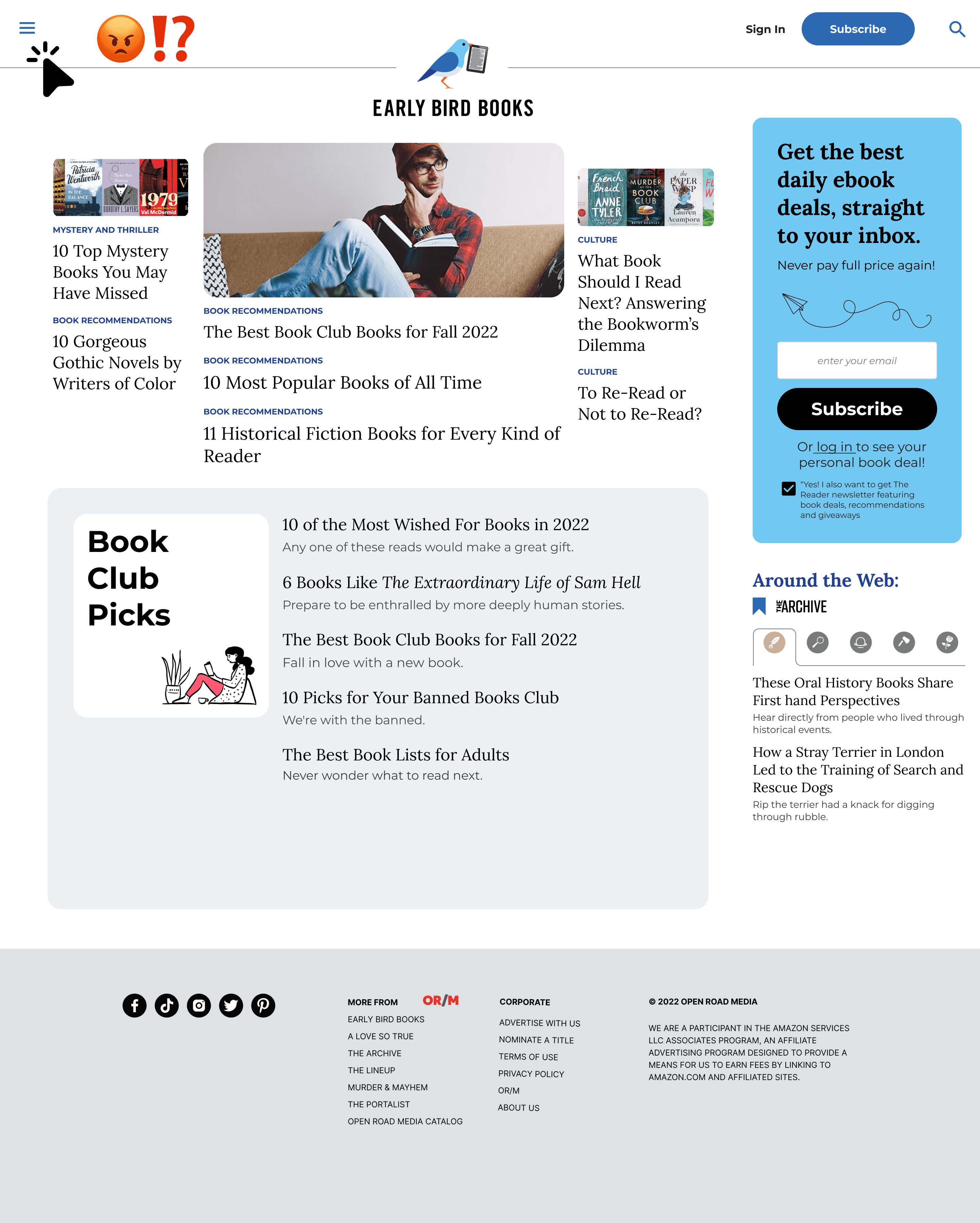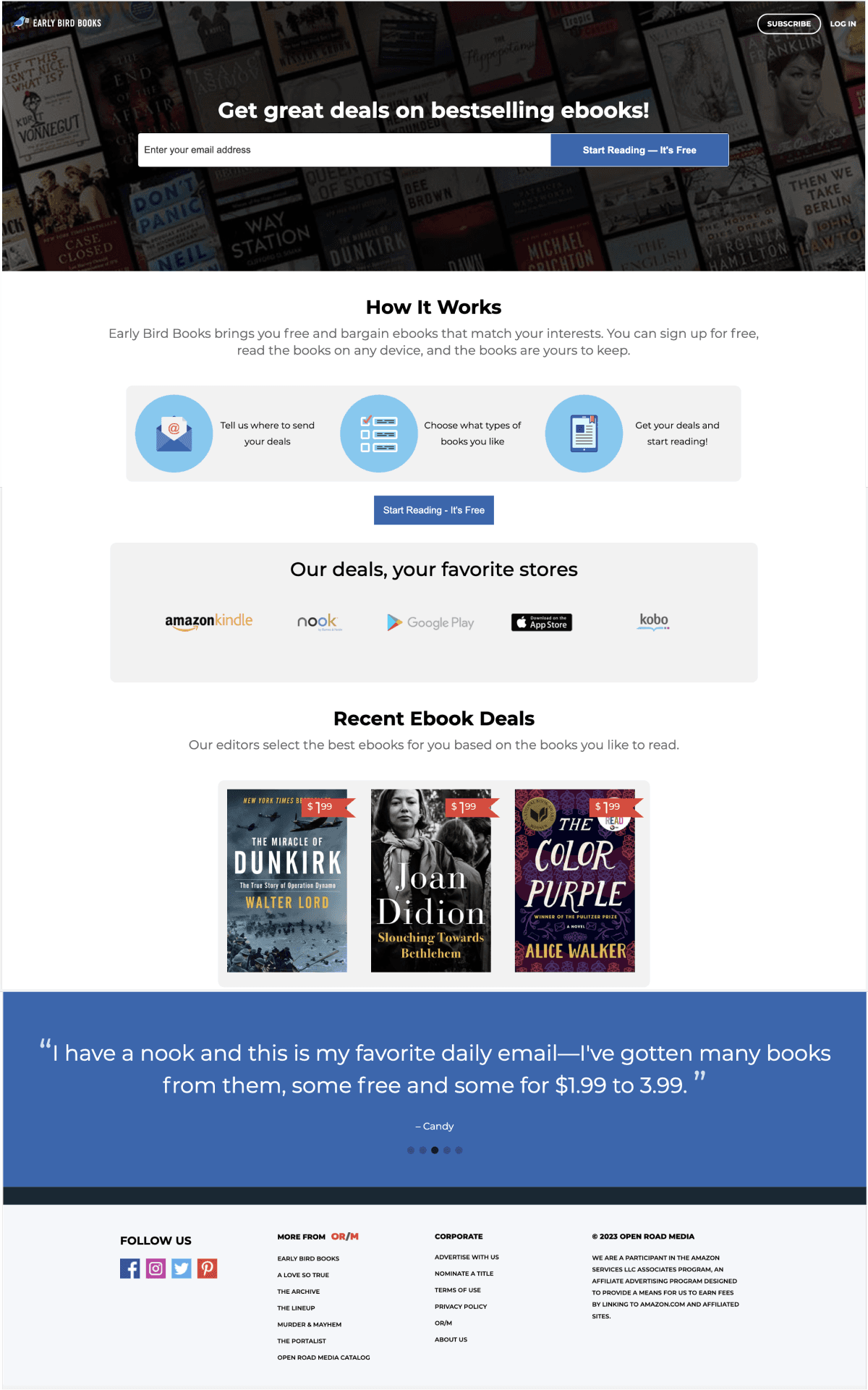 Early Bird Books is a content website owned by Open Road Integrated Media. The Early Bird Books website provides daily content for book readers. Early Bird Books started as a newsletter featuring deals on popular ebooks and evolved into a branded content site. The homepage was originally designed as a funnel to get users to sign up for the newsletter. ORIM also owns A Love So True, The Portalist, The Archive, Murder & Mayhem, and The Lineup, content marketing sites that cater to niche audiences of book readers.
